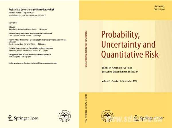 《Probability,Uncertainty and Quantitative Risk 》由中国科学院院士、山东大学彭实戈教授任主编,法国一级教授、中国“海外高层次人才引进计划”特聘教授Rainer Buckdahn任执行主编,来自13个国家和地区的38位国际著名学者任编委。山东大学自然科学学报编辑部与国际著名出版集团Springer Nature合作出版,采用SpringerOpen免费开放获取模式,读者可以通过SpringerOpen的在线平台(http://probability-risk.springeropen.com/)直接浏览和下载论文。该期刊第一期发表了由德国弗莱堡大学Ernst Eberlein教授、美国中佛罗里达大学Jiongmin Yong教授、德国曼海姆大学Alexander Schied教授、法国勒芒大学Yu A. Kutoyants教授为第一作者或通讯作者的4篇高水平论文。主编彭实戈院士撰文,对期刊的办刊宗旨和刊发范围作了详细的介绍。纸质期刊由山东大学自然科学学报编辑部负责印刷出版。