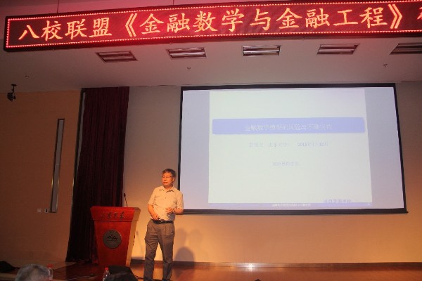 山东大学副校长、山东大学威海校区校长刘建亚教授和山东大学威海校区党工委书记尹作升出席了7月16日的开班仪式。刘建亚教授对参加暑期学校的师生表示热烈欢迎,并介绍了山东大学的发展历史、办学特色、办学目标、研究生培养情况和八校联盟暑期学校的基本情况。南开大学数学学院院长郭军义教授,上海交通大学数学科学学院院长李从明教授,苏州大学袁先智教授,上海财经大学数学学院副院长徐定华教授等各校代表上台致辞,表达了对此次活动的支持与祝愿。中国科学院院士,山东大学彭实戈教授介绍了举办暑期学校的初衷和宗旨,希望同学们利用暑期学校的机会,开阔视野,培养能力,力争成为未来中国金融数学的中坚力量。山东大学中泰证券金融研究院副院长林路教授主持开班仪式。开班仪式结束后,彭实戈院士作了题为金融数学模型的风险与不确定性的主旨报告。
