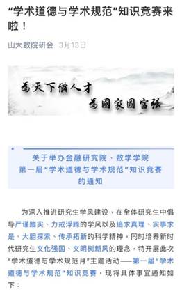 为大力弘扬科学家精神,引导广大研究生传承优良学风、坚守学术诚信,数学学院、金融研究院联合开展了“学术道德与学术规范”主题月系列活动。通过举办学术道德主题展、学术规范知识竞赛、专题讲座、倡议书等形式多样的活动,推动学术道德和学术规范深入人心,为广大研究生未来的学习科研打下了坚实的基础。