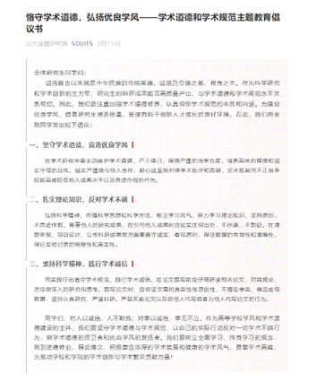 3月11日,学院于线上公众平台发布了学术道德规范倡议书,从坚守学术道德、反对学术不端、营造优良学风三方面深刻阐明了恪守学术道德、弘扬优良学风的重要意义和现实价值,全体研究生在倡议书上签名,在一言一行中扩散恪守学术道德和学术规范的正能量。