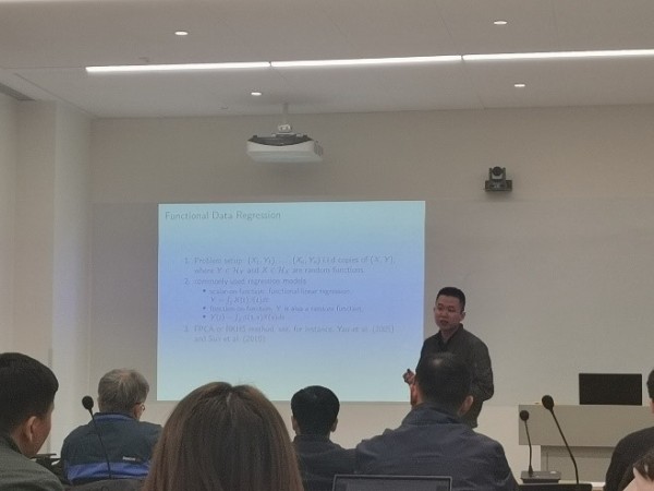桑培俊教授向大家介绍了他们最近提出的一个非线性函数对函数回归模型,其中协变量和响应变量都是随机函数。非线性回归模型分两步进行:首先构造希尔伯特空间来容纳协变量函数和响应函数,然后构造第二层希尔伯特空间来寻找协变量和响应变量间的非线性关系。此外,桑培俊教授还介绍了估计量的收敛速度以及预测的响应变量在希尔伯特空间的弱收敛性。