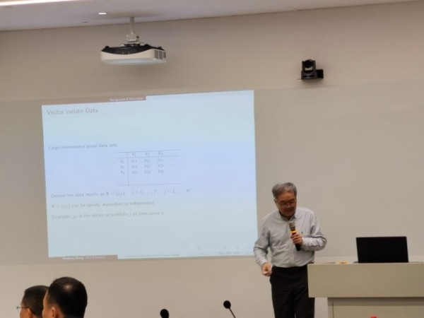 随后各位专家依次进行报告。张新生教授主要讲解了高维矩阵因子模型的投影估计,通过将观测矩阵投影到行或列因子空间上,将矩阵级数的因子分析简化为一个低维张量的因子分析。张新生教授指出该方法减少了奇异误差分量的大小,从而提高了信噪比并从理论上证明了在相似条件下,因子加载矩阵的投影估计比现有估计具有更快的收敛速度。