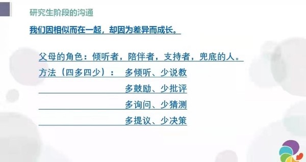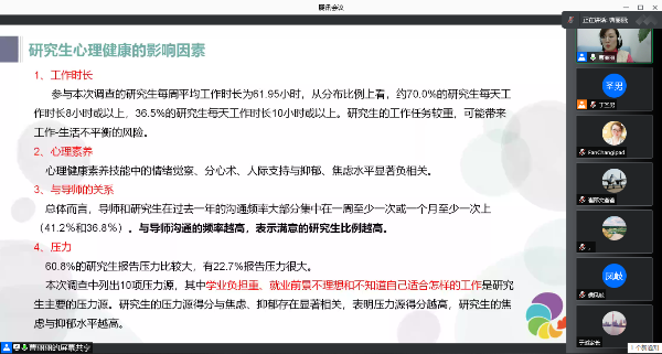 讲座期间,曹老师主要从研究生心理特点、父母的心理状况以及如何做好亲子沟通、提供心理支持三个方面进行介绍。曹老师指出,当前研究生的心理状况较为严峻,抑郁、焦虑、躁狂等问题出现的平均水平显著较高,而该现象的产生与研究生工作时长、心理素质、导师以及压力等因素密切相关。同时,曹老师强调,大多数研究生正处于成年初期,虽然具有较强的自我意识和认知能力,但并不意味着完全不需要家长的引导和帮助。家长唯有及时调整心态,善于“发展自己”,才能更好地助力孩子的成长成才。讲座最后,曹老师为家长详细讲解了“四多四少”的沟通方法,建议父母扮演好倾听者、陪伴者、支持者的角色,成为孩子可以依赖的“兜底人”。