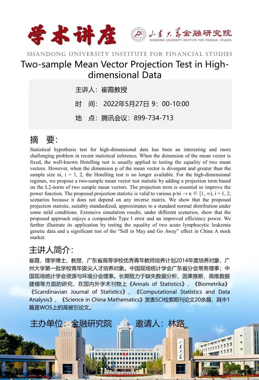 报告题目:Two-sample Mean Vector Projection Test in High-dimensional Data