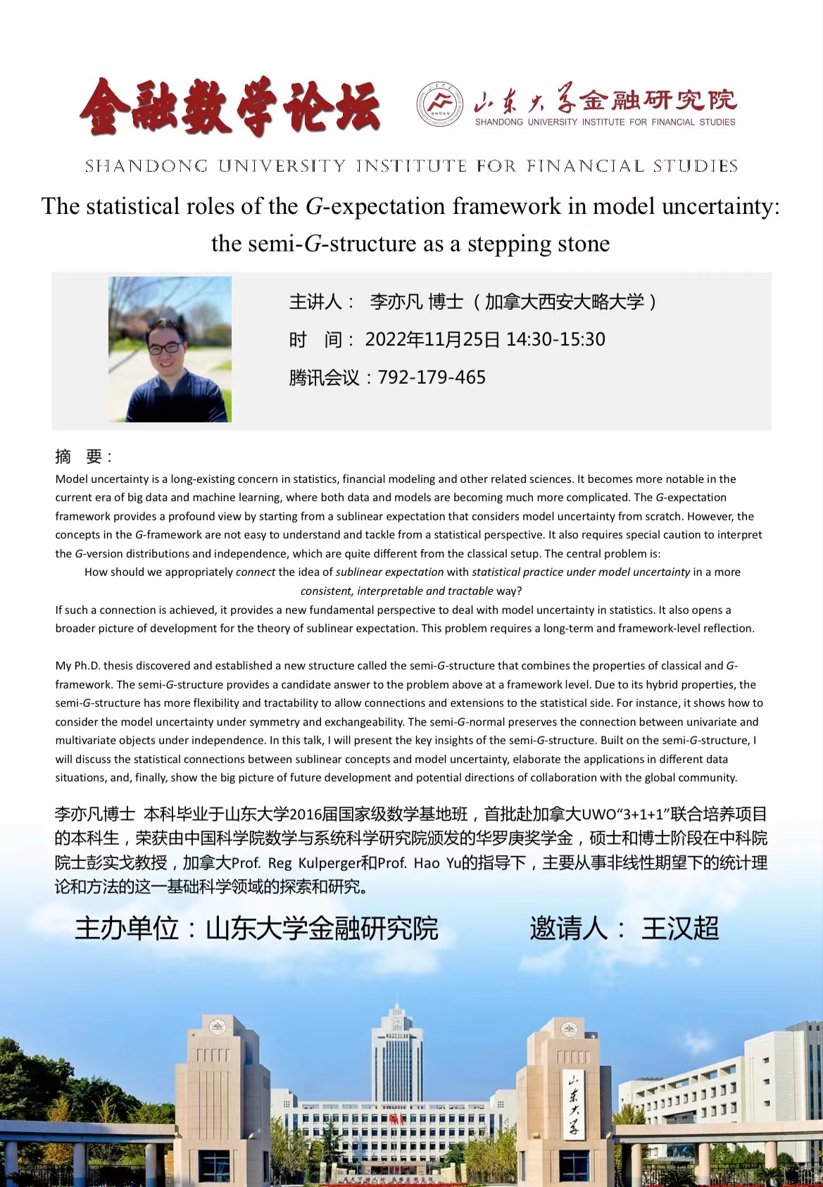 报告题目:The statistical roles of the G-expectation framework in model uncertainty:the semi-G-structure as a stepping stone