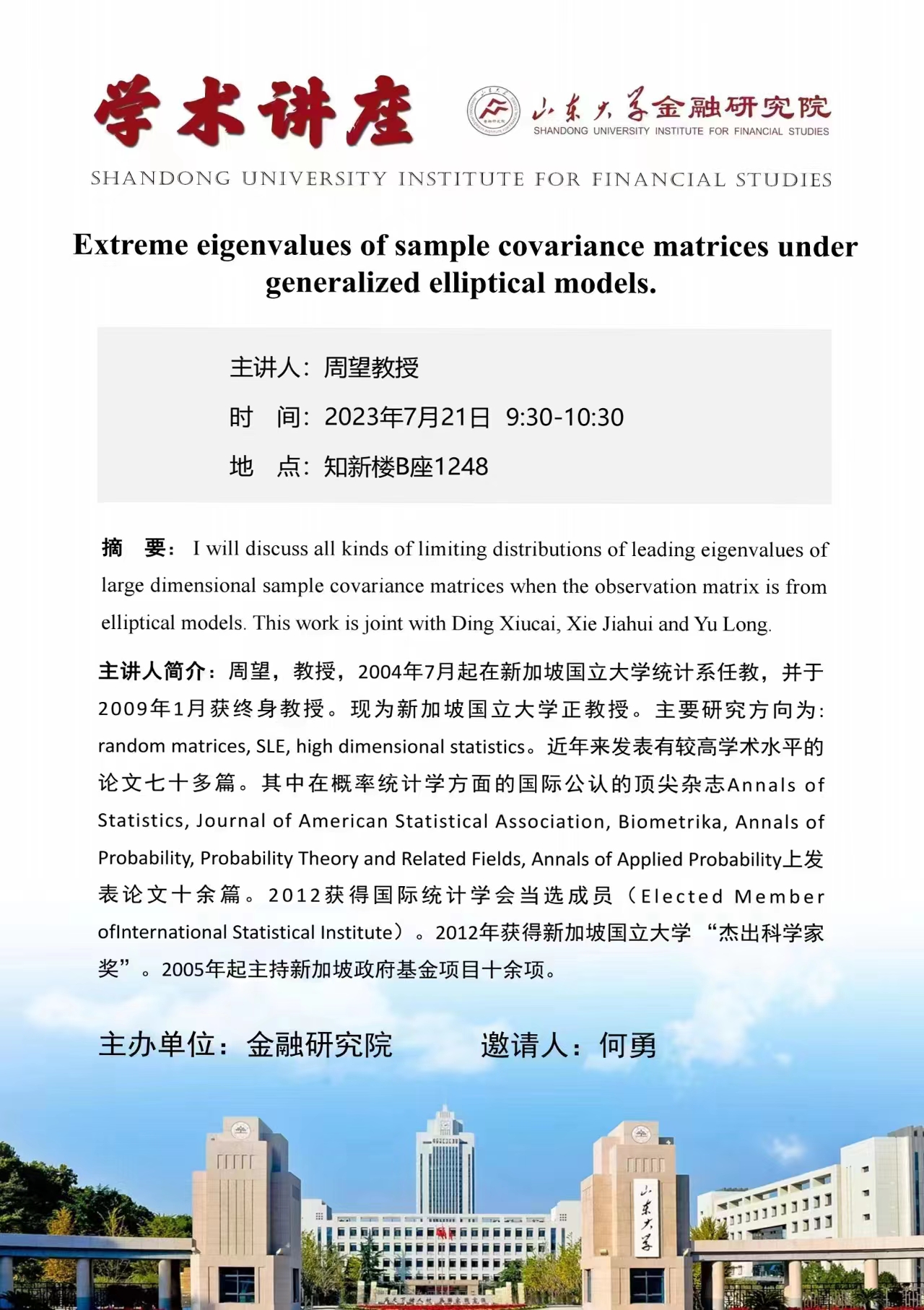 报告题目:Extreme eigenvalues of sample covariance matrices under generalized elliptical models