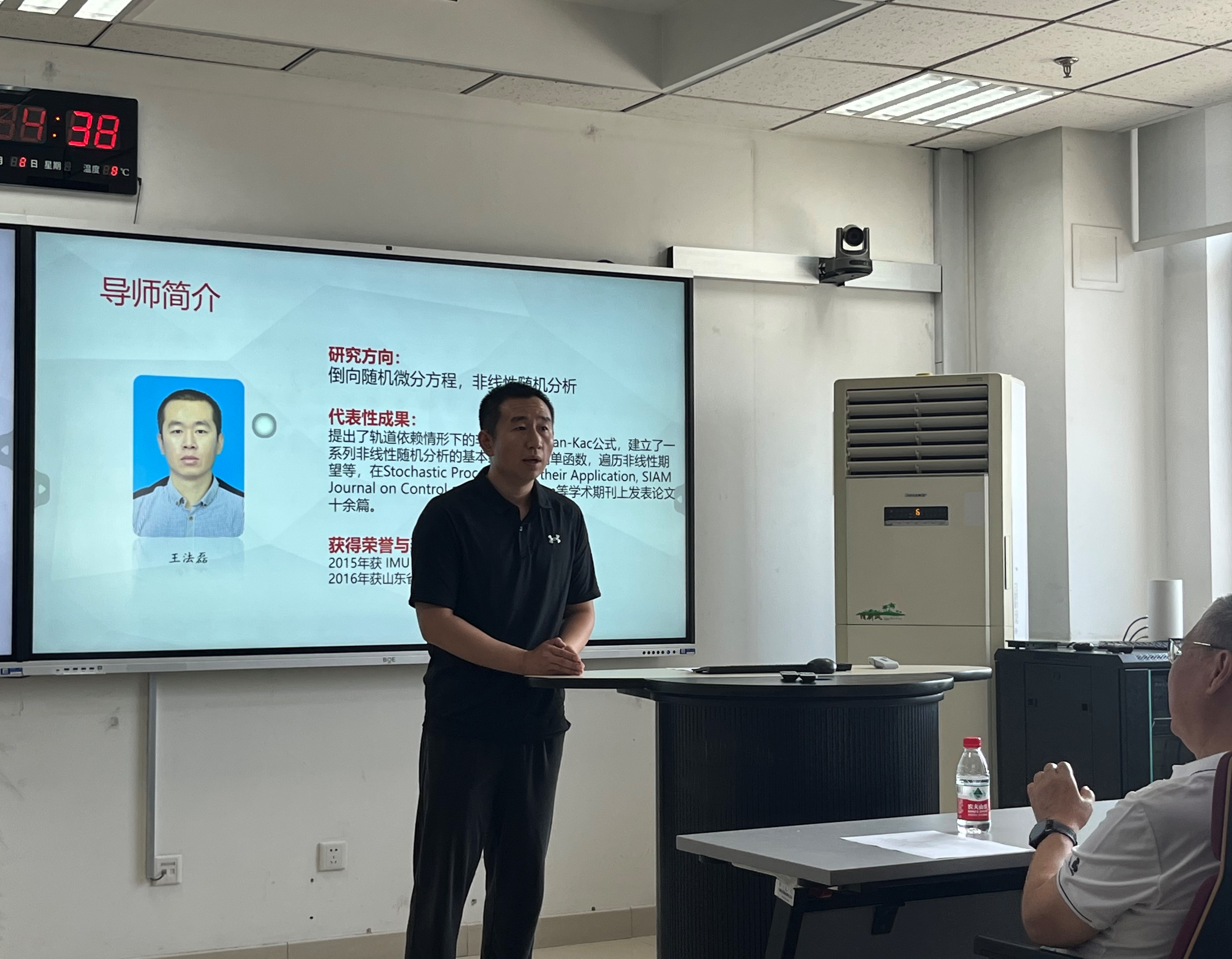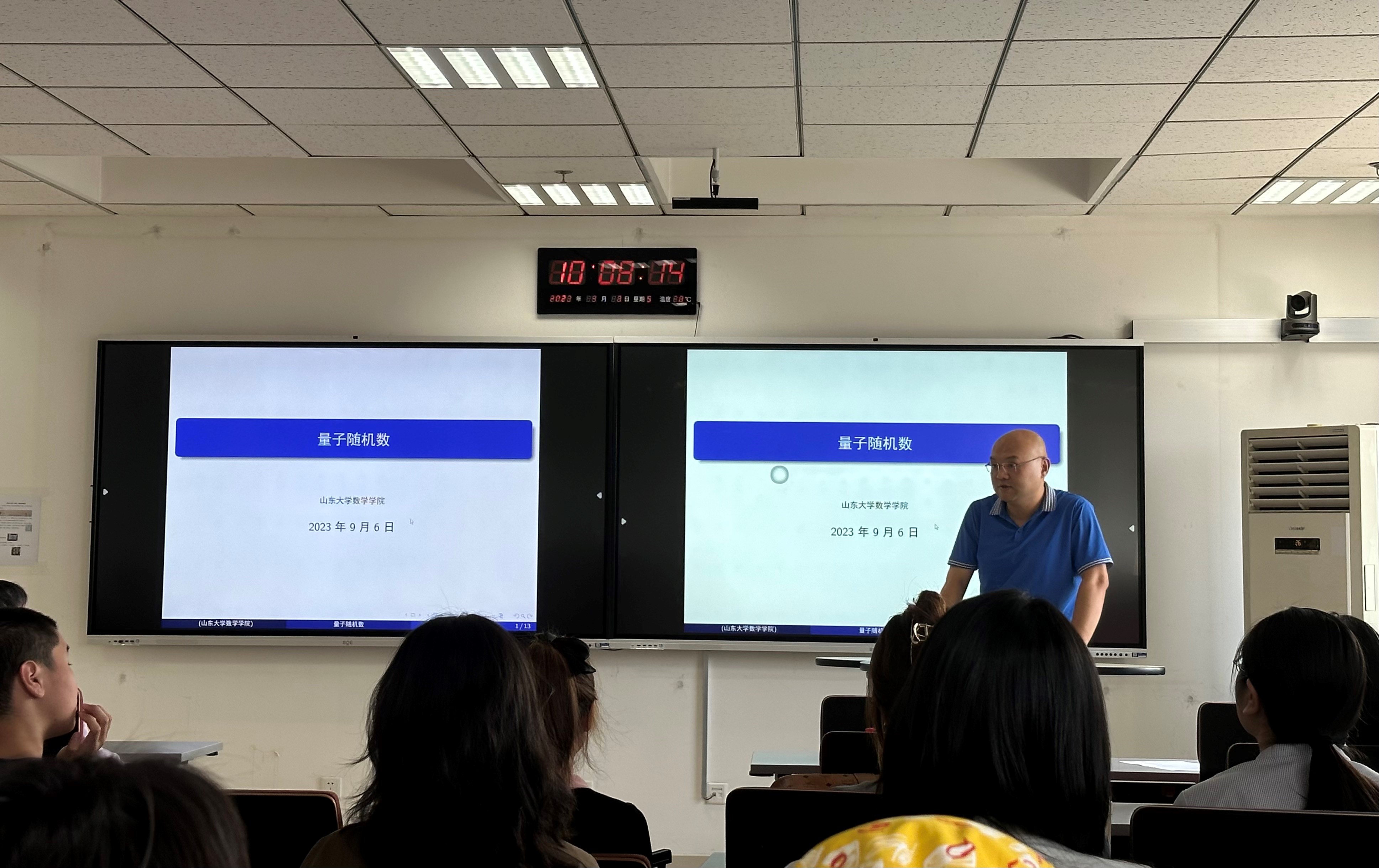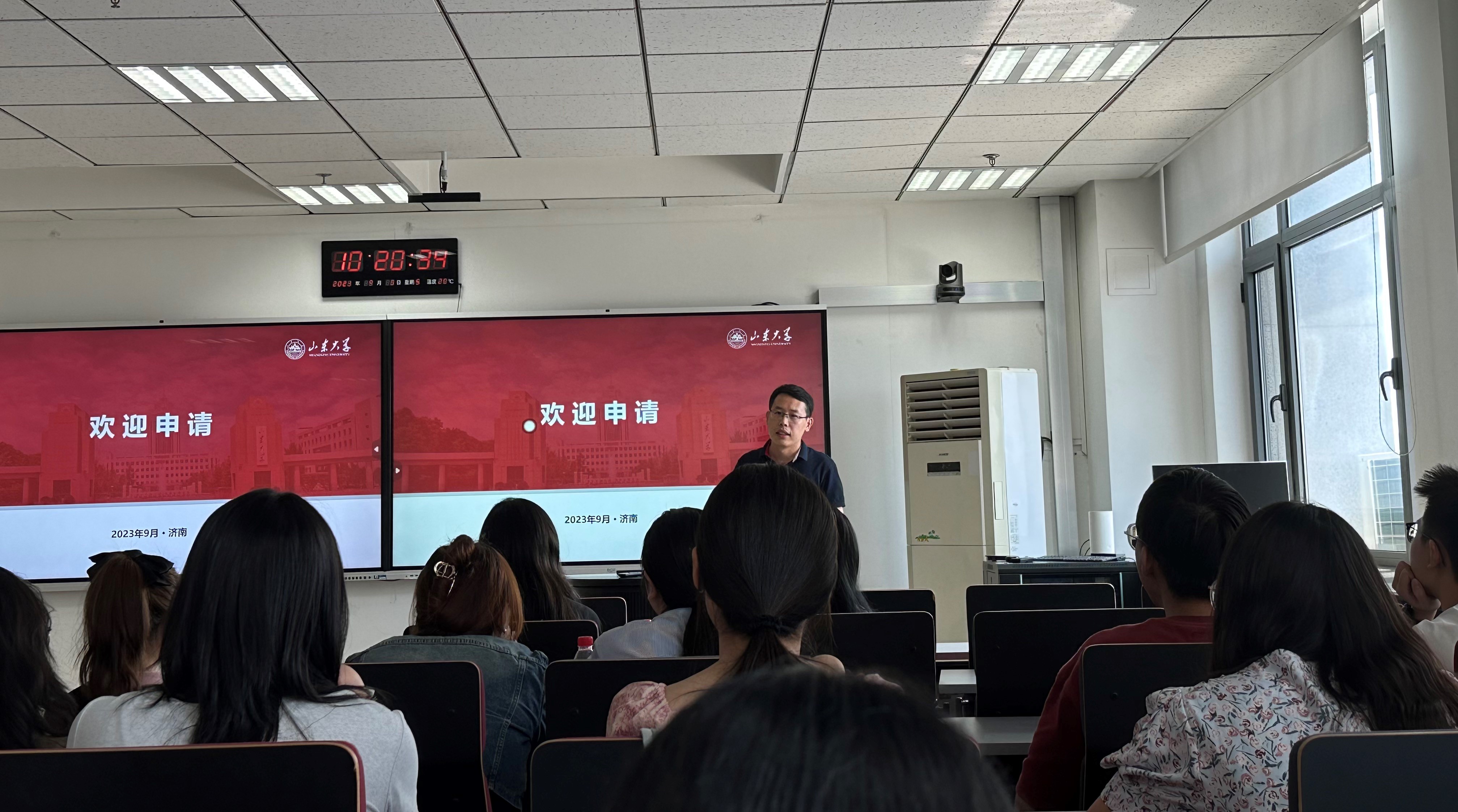 出席本次会议的诸位老师分别就各自分管的工作进行了详细介绍,并对2023级研究生新同学成为山大人表示热烈欢迎。嵇少林副院长对金融研究院师资力量、人才培养及专业方向设置等内容进行了具体介绍。王法磊副教授在讲话中呼吁新生踊跃加入山东大学国家应用数学中心,并介绍了应用数学中心的主要项目。接下来,王汉超教授、杨淑振副教授、吴盼玉教授和季加东老师依次上台,分别为新生介绍了量子随机数、山东大学与银行合作中所负责的项目、大数据等领域的项目以及数学在医学领域的应用。