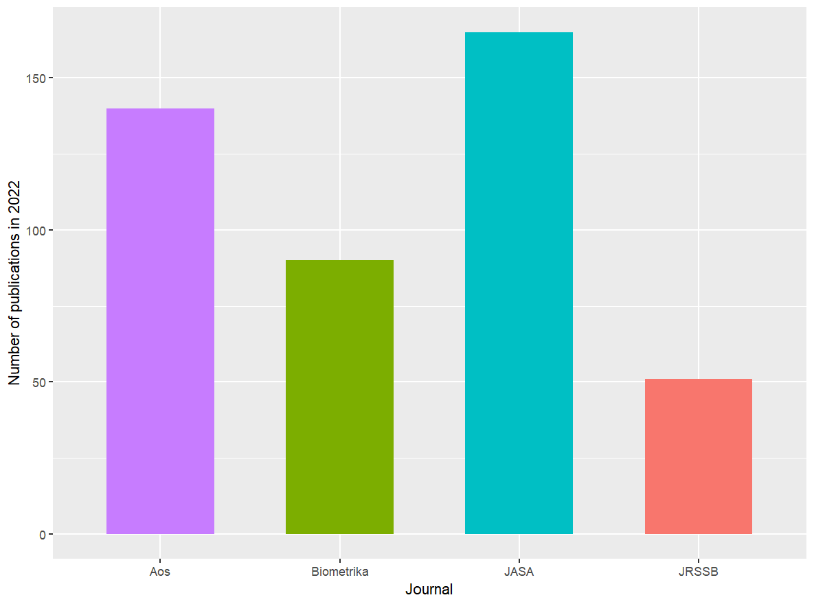 统计学四大顶刊指的是统计学领域公认的四大顶级杂志,其中包括 Journal of the Royal Statistical Society, Series B (JRSSB:皇家B) 、Annals of Statistics(AOS) 、Journal of the American Statistical Association (JASA)、和Biometrika。 其中JRSSB是由英国皇家统计学会主办的学术期刊,该刊为季刊,每期收录15篇左右的文章,年文章总数50篇左右,属于四大中发表难度系数最大的杂志。以2022年为例,统计四大期刊年发文量如下:
