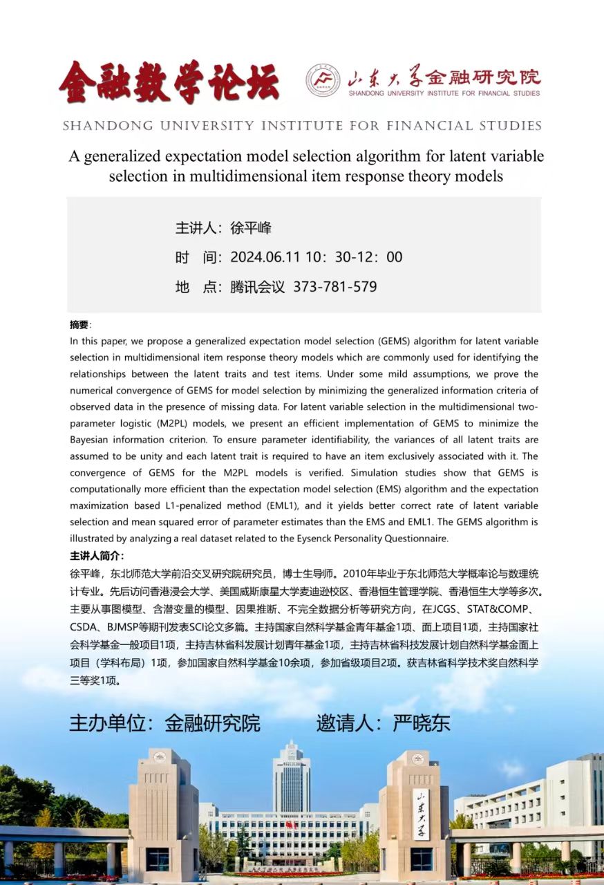 报告题目:A generalized expectation model selection algorithm for latent variable selection in multidimensional item response theory models