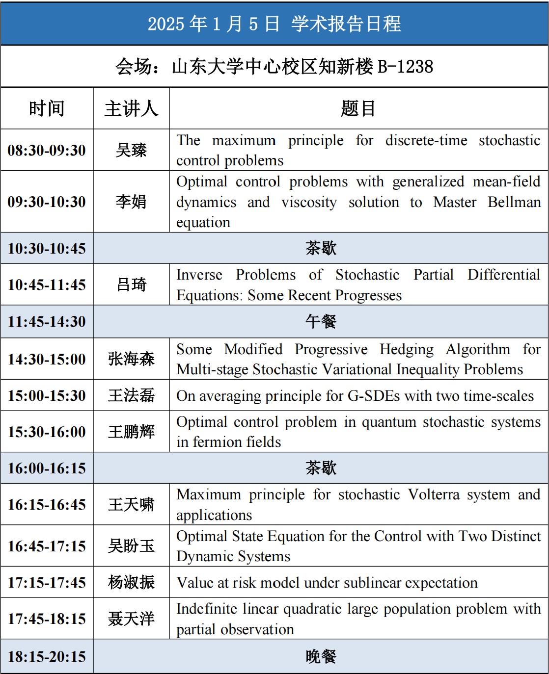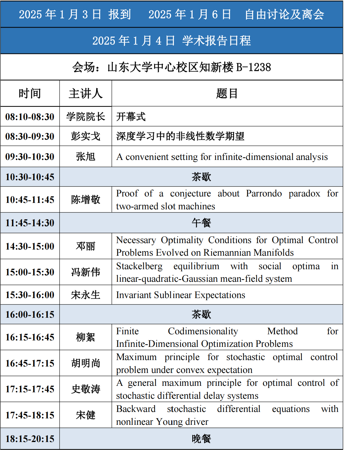 第一届控制理论、金融数学与非线性期望研讨会将在我院举行,会议日程安排如下: